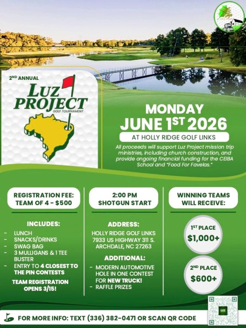 All proceeds from our 2nd annual golf tournament will go to Luz Project, a 501(c)(3) nonprofit mission organization that has ministered to the poor and needy in Alagoas, Brazil for 29 years. In June of 2026, Luz Project will build its 39th church as it partners with local churches and pastors. In addition to construction, Luz Project provides sports camps, women’s, and children’s ministries during annual mission trips. Ongoing community support occurs throughout the entire year as local volunteers assist with Food for Favelas, after-school tutoring, and support of a Christian education and community center.